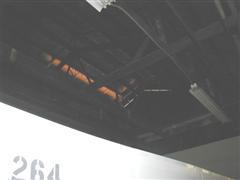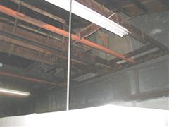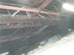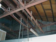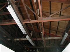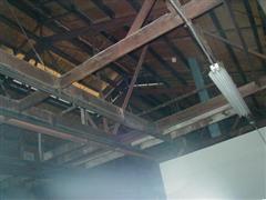 We walked in the building and saw a couple long hallways, lined with doors, like any other storage facility. We took the elevator to the top floor, and here's where it gets a little hard to explain. The top floor consists of similar hallways and doors, but there's no ceiling. Above is the beams and the rafters that make up and support the ceiling. The first thing we see when we got off the elevator was this weird metal rack/pulley contraption, which you can see in the picture below, that's obviously not part of the support of the roof, so we figure must be left over from the studio.