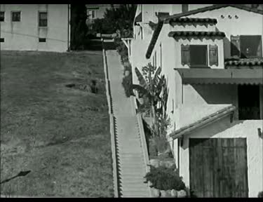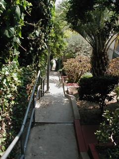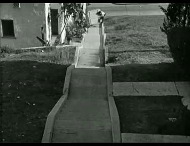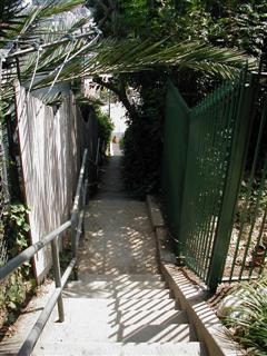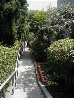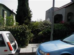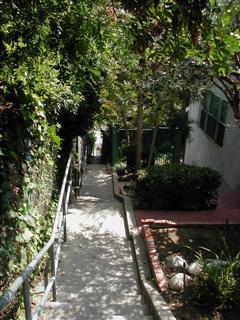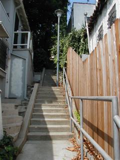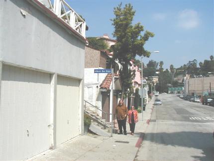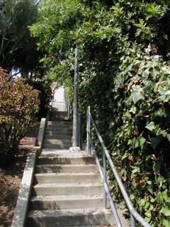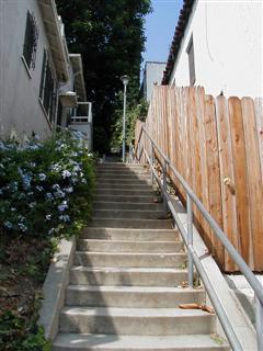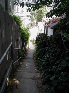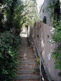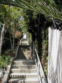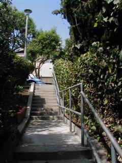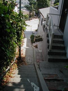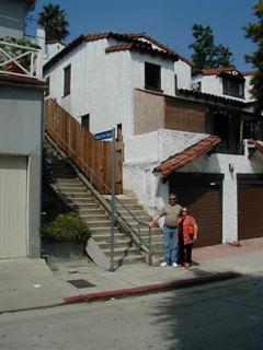 We parked the element a couple doors away and walked back. If the street sign wasn't there, we might have missed them. Just like the earlier set of stairs, there has been a lot of construction in this area in the years since the film was made, and the foliage seems even denser than at the previous set. It's almost impossible to spot landmarks to compare the two.