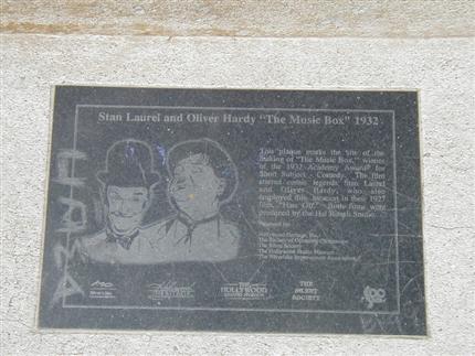 Yes, MORE STEPS! These are the steps that Stan and Ollie hauled the piano up in the classic short "The Music Box" from 1932. Unlike the Stooges Steps, these are located in between two buildings on a crowded street. I've read that people frequently confuse the two sets of steps, because they are very similar. But another difference between the two is that these are actually marked with a street sign and a plaque embedded in one of the lower stairs. The story goes that the plaque was defaced with grafitti within hours of it being placed, but fortunately you can still read it. It's a shame that stuff like this happens.